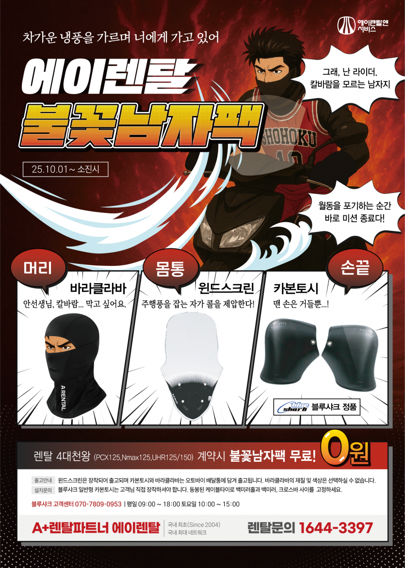 ※ 진행내용: 대상기종 계약시 30만원 상당 불꽃남자팩(윈드스크린, 블루샤크 정품 카본토시, 바라클라바 제공)